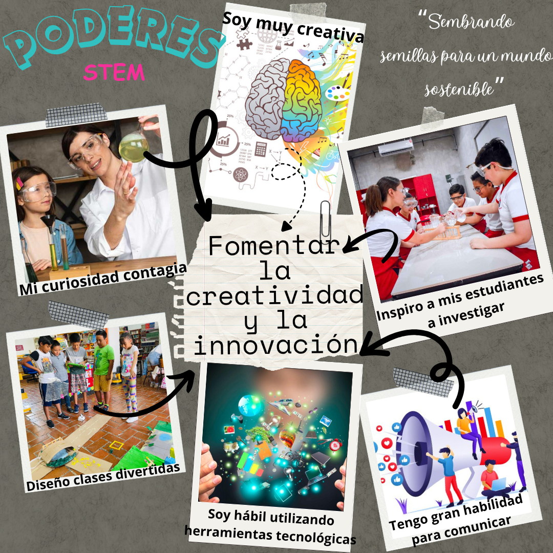 • Alrededor de tu propósito central, identifica y representa visualmente al menos 5 “superpoderes” o habilidades que posees y que consideras valiosas para guiar a tus estudiantes en el camino STEM. (Ejemplos: pasión por la ciencia, habilidad para explicar conceptos complejos, creatividad para diseñar proyectos, conocimiento de herramientas tecnológicas, empatía y escucha activa, capacidad para motivar y dar feedback).